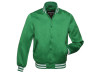 Satin Custom Varsity Jackets made of Top Quality Satin green for body and Polyester Satin Sleeves green . We made it high quality acrylic ribbing bottom, collar, cuff, high quality varsity snaps and inside quilted diamond laser lining for this Satin Custom Varsity Jackets.